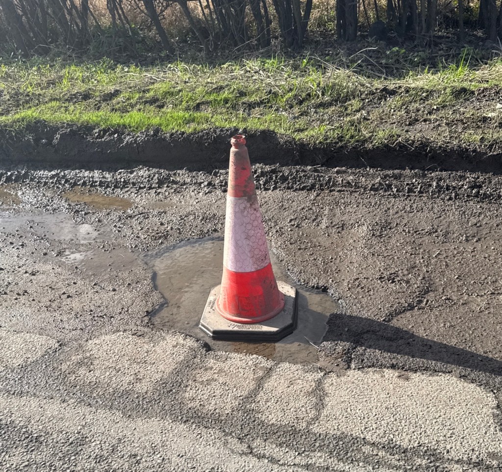 There are so many potholes, thousands waiting to catch unsuspecting drivers or riders. The days of a relaxing drive in the countryside replaced by a never ending slalom, trying to avoid a suspension killing impact. Every week more and more appearing as the local Council has adopted a ‘no intervention policy’. Every week more and more getting deeper. On the way to our closest store there is one pothole almost in the middle of the road which is 6 inches deep and two foot wide. Drivers now resorting to leaving warning cones all over the roads to try and ward off more cars dropping into the abyss.